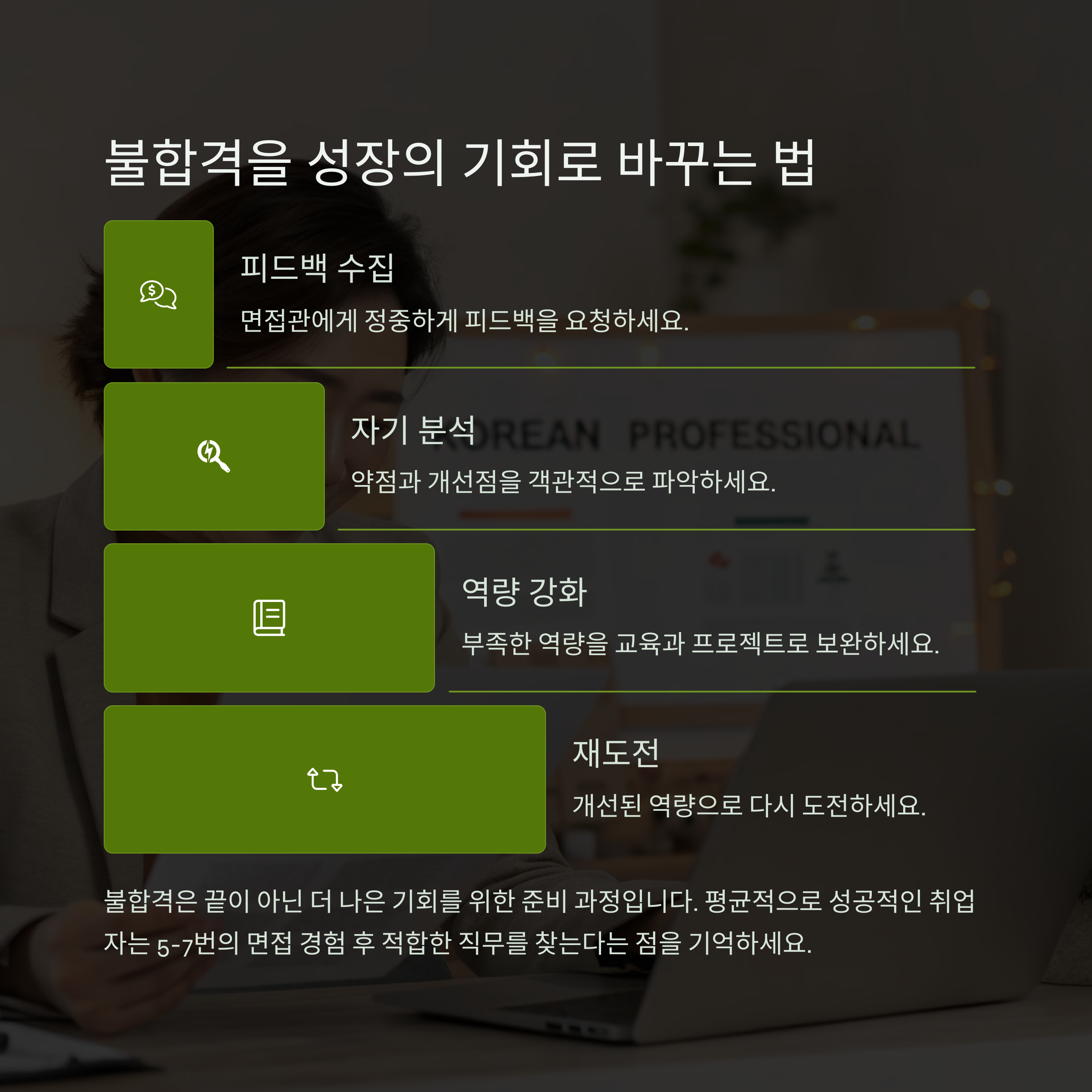 - 피드백 수집 및 분석: 불합격했다면 피드백을 요청해 개선점을 파악하세요.