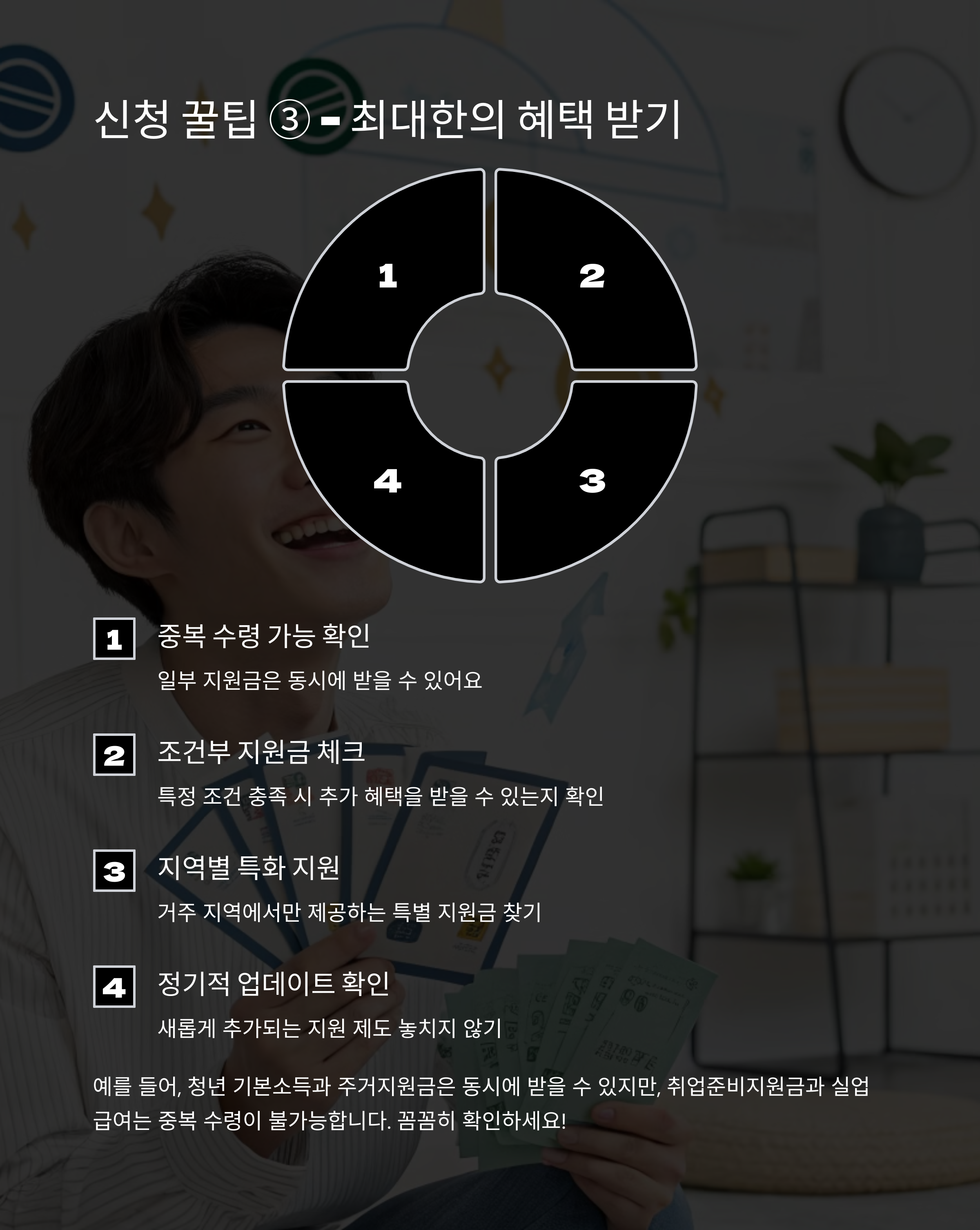 - 여러 지원금을 중복 신청하세요 – 일부 지원금은 중복 수령이 가능하니 해당되는 모든 지원금을 신청하세요