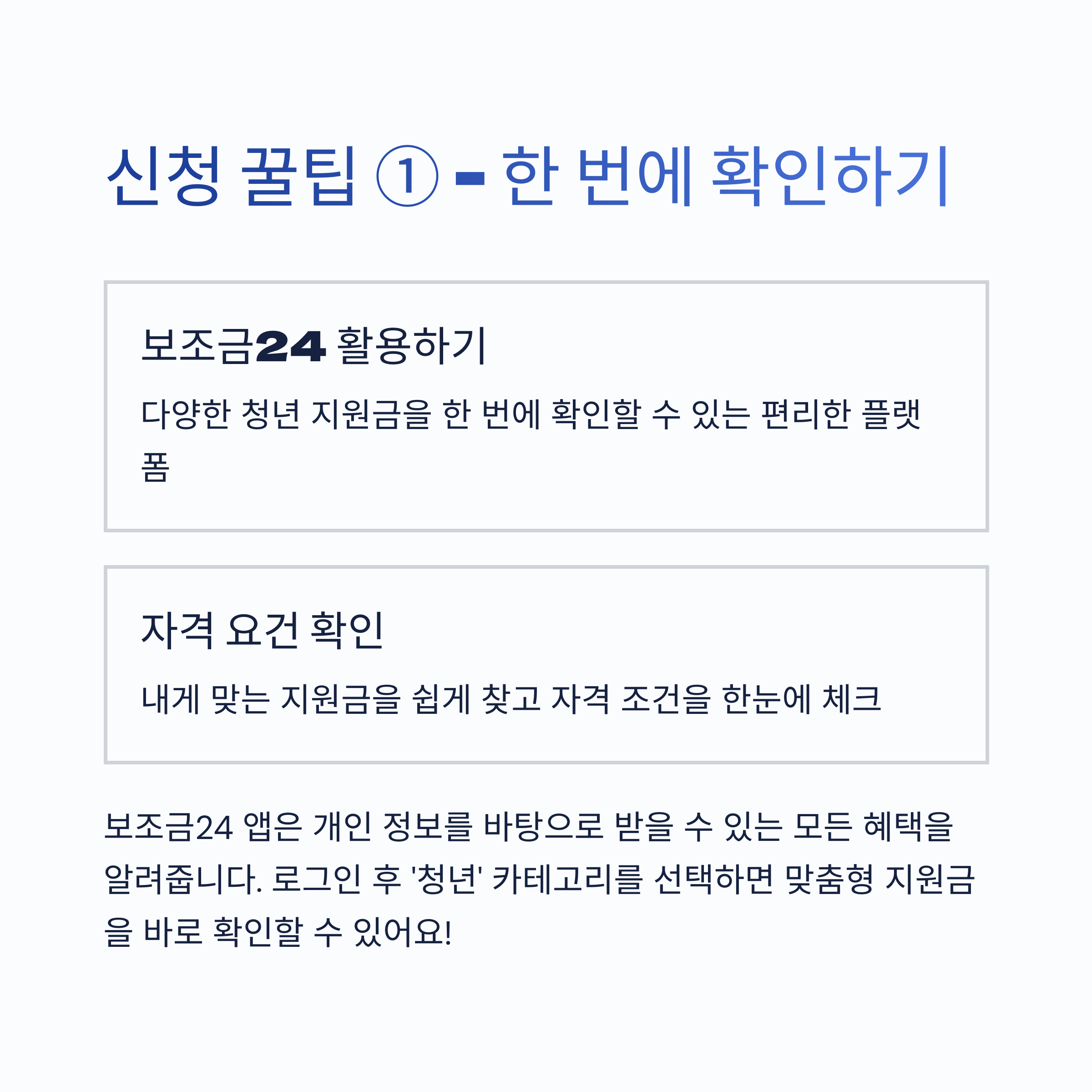 - 보조금24를 활용하세요 – 한 번의 조회로 내가 받을 수 있는 모든 지원금을 확인할 수 있어요