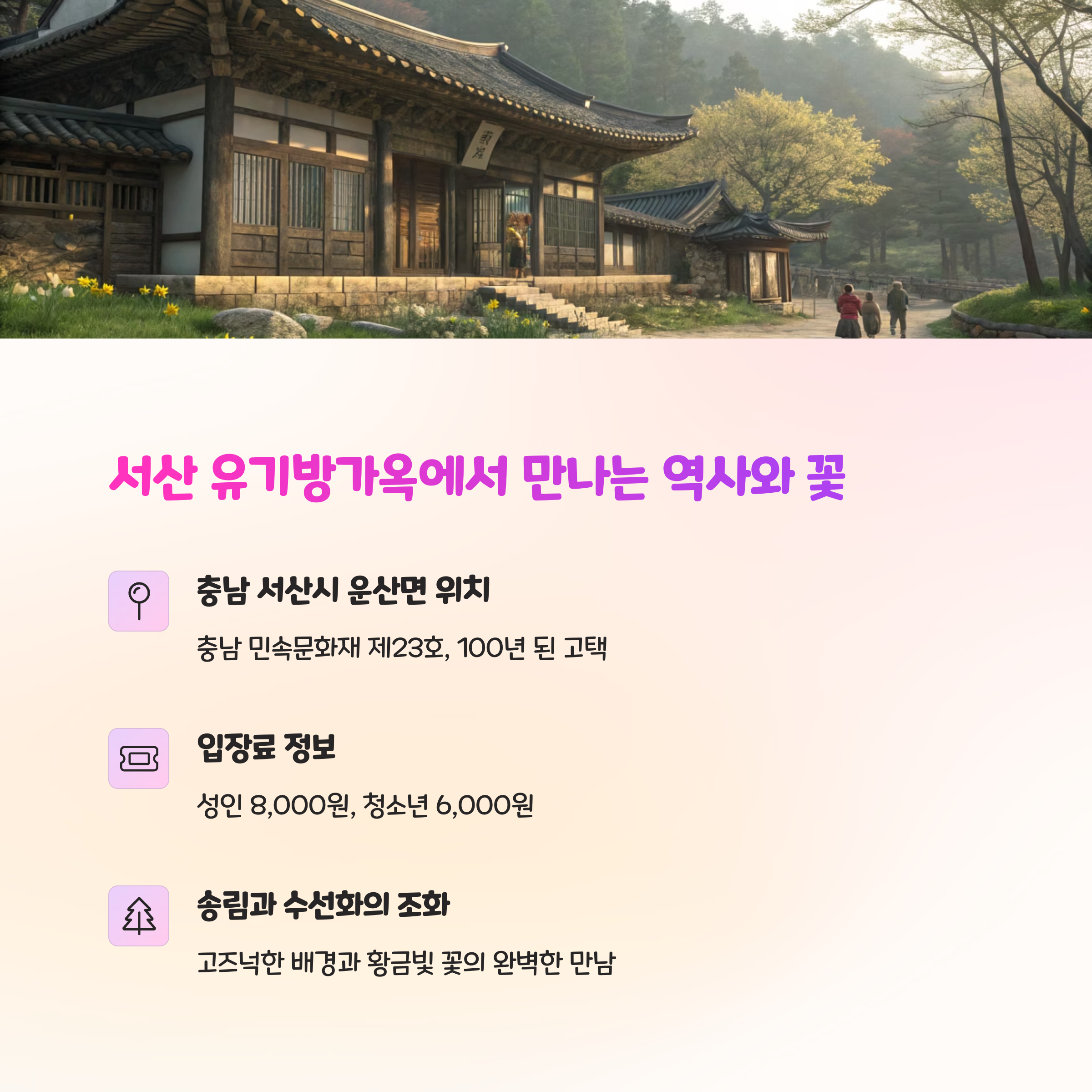 100년이 넘은 고택과 노란 수선화의 조화가 정말 아름다워요. 마치 시간이 멈춘 듯한 풍경 속에서 걷다 보면, 마음이 편안해지는 걸 느낄 수 있어요.