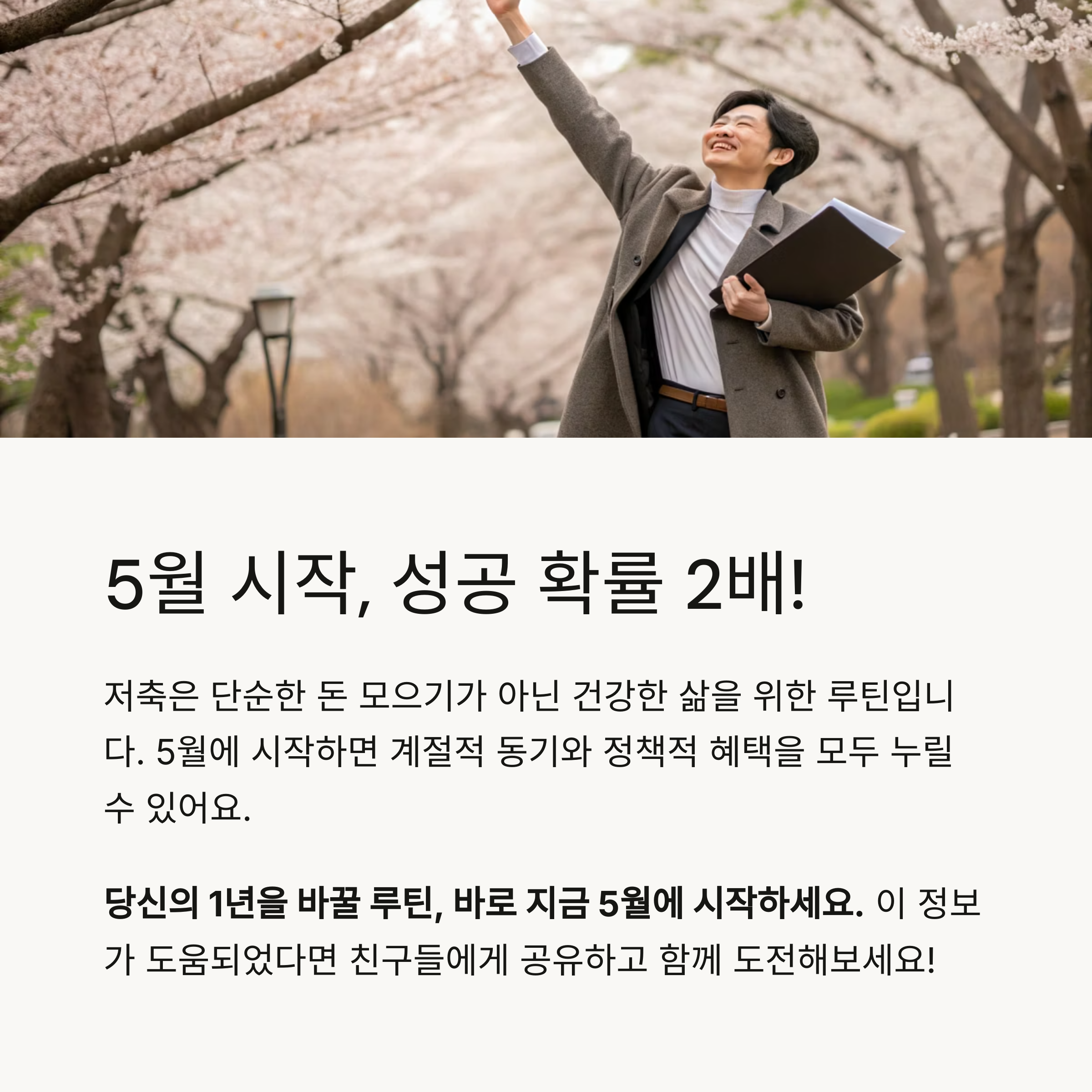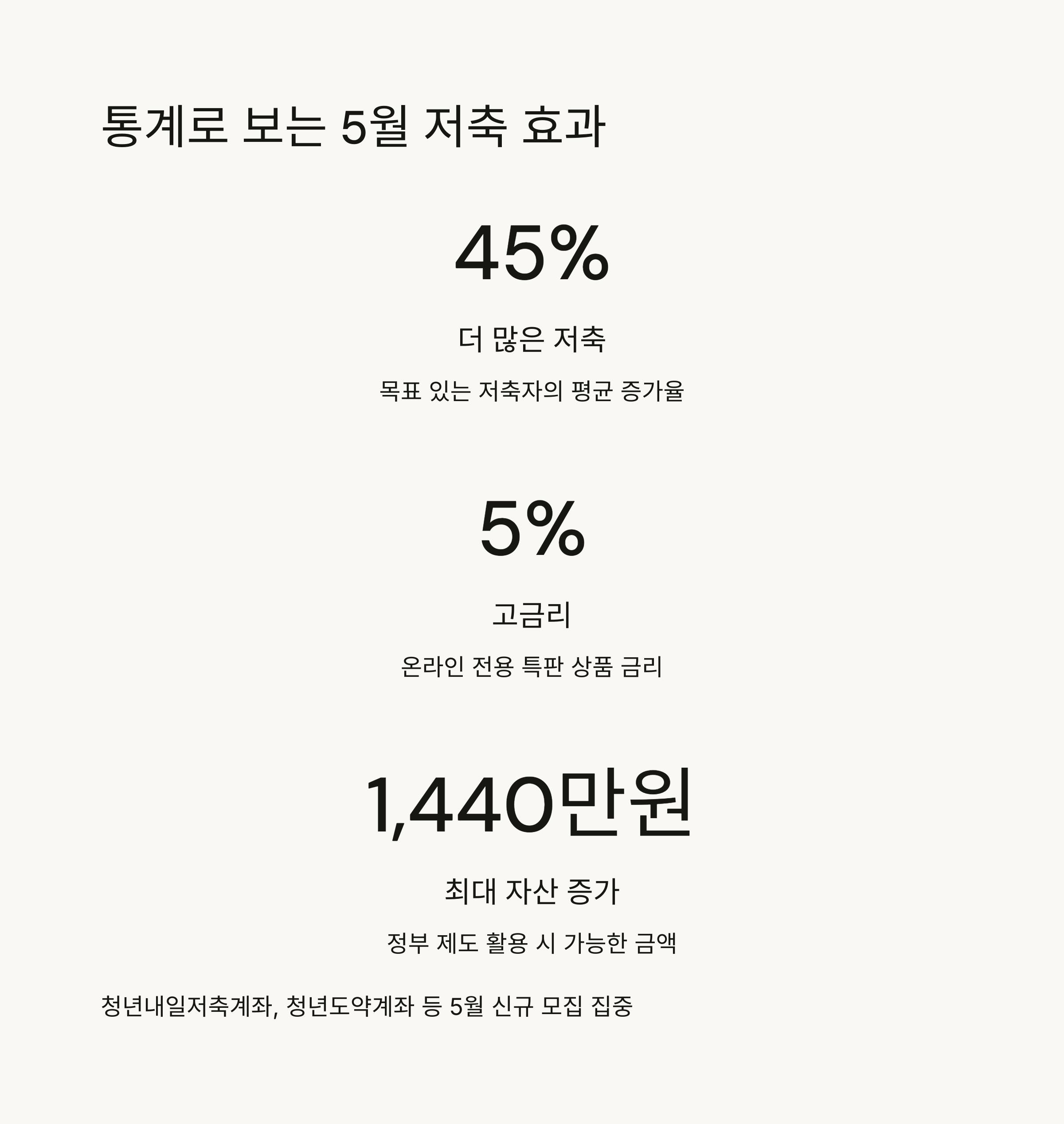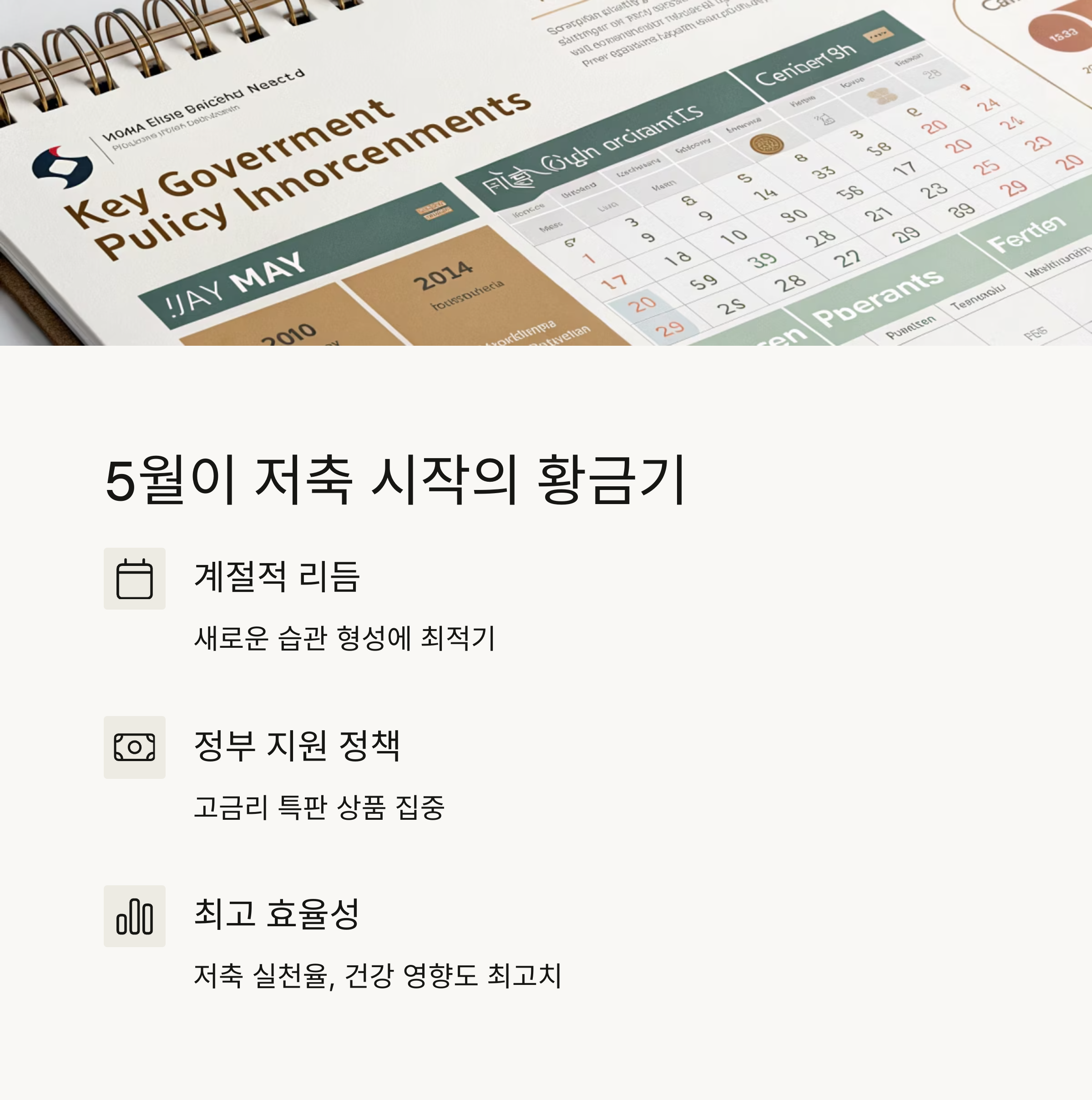 정부 지원 정책, 고금리 특판 상품, 웰빙 캠페인 등도 5월을 타깃으로 집중되므로 이때 시작하는 저축 습관은 효과가 높습니다.