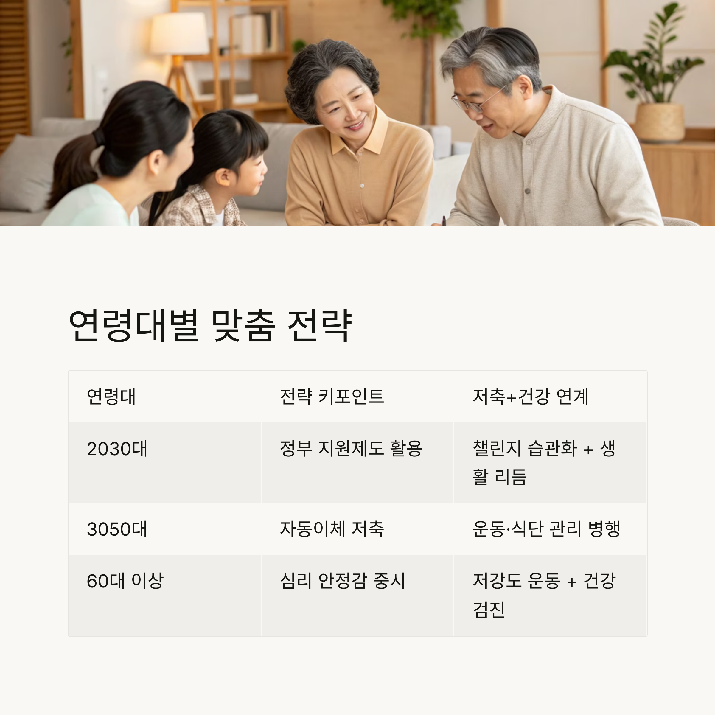 | 30~50대 | 자동이체 저축 + 가족 루틴화 | 운동·식단 관리 병행 |