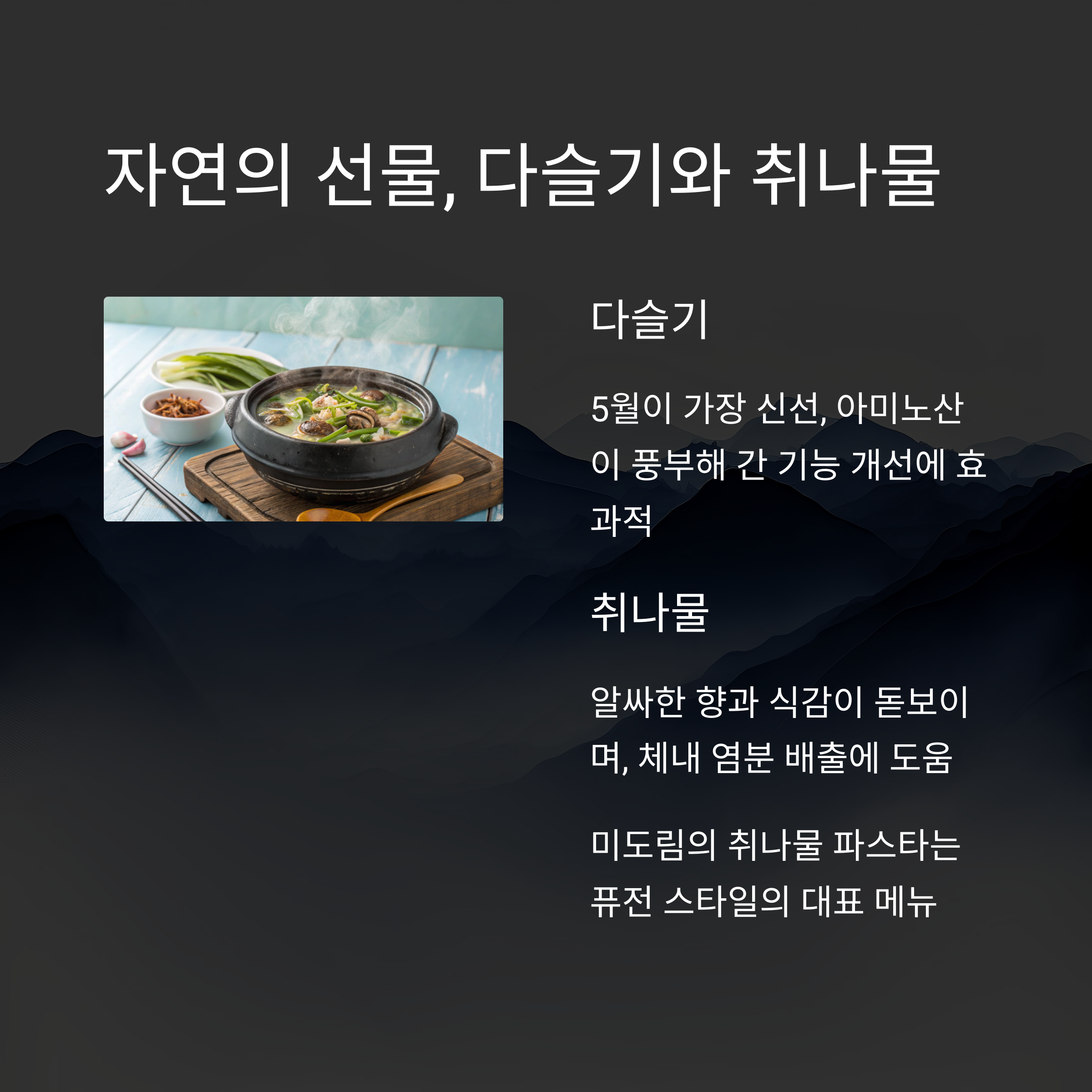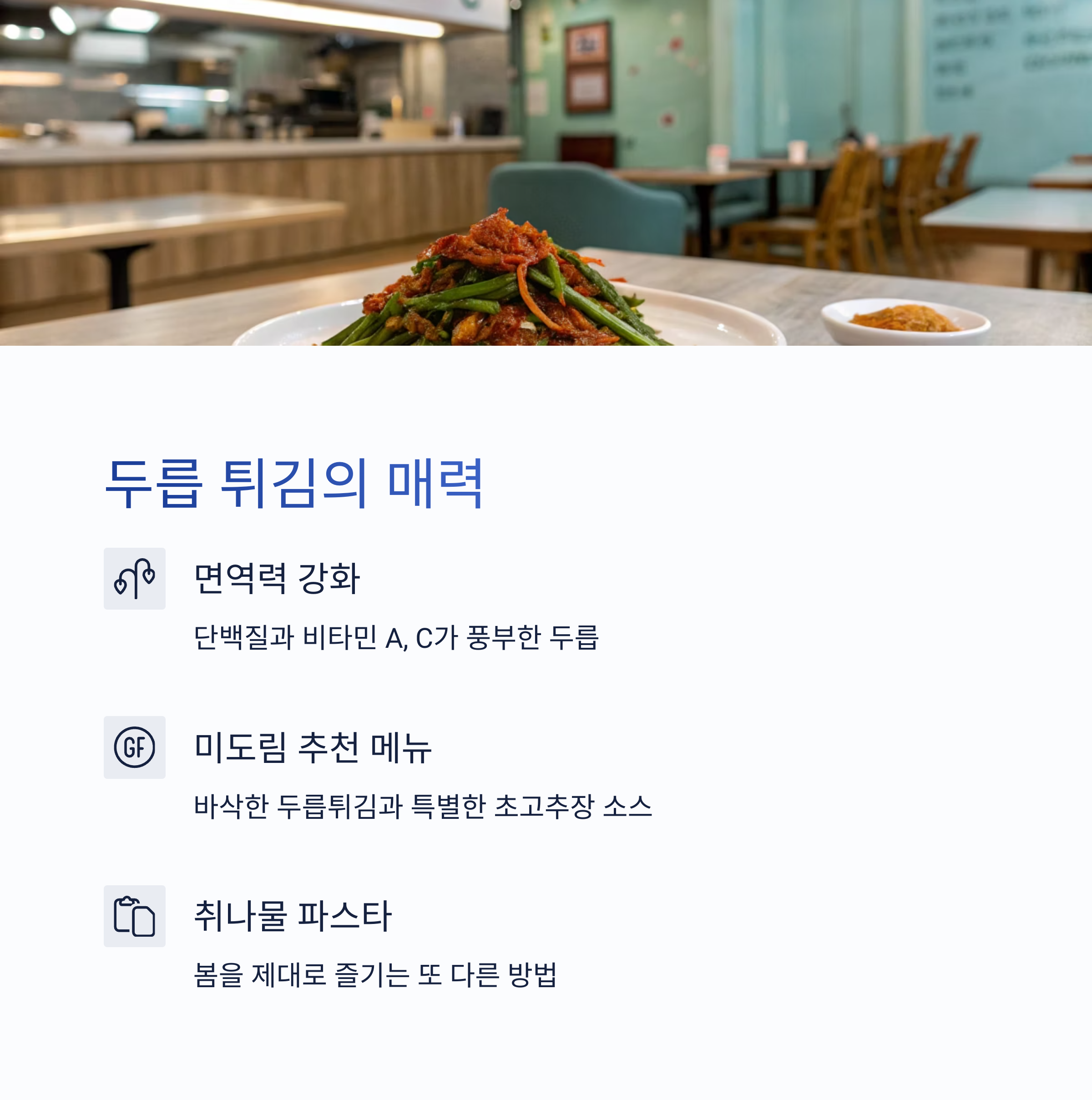 취나물은 봄철 가장 인기 있는 나물 중 하나로, 서울 미도림의 취나물 파스타는 퓨전 스타일로 변주된 대표 메뉴입니다.
