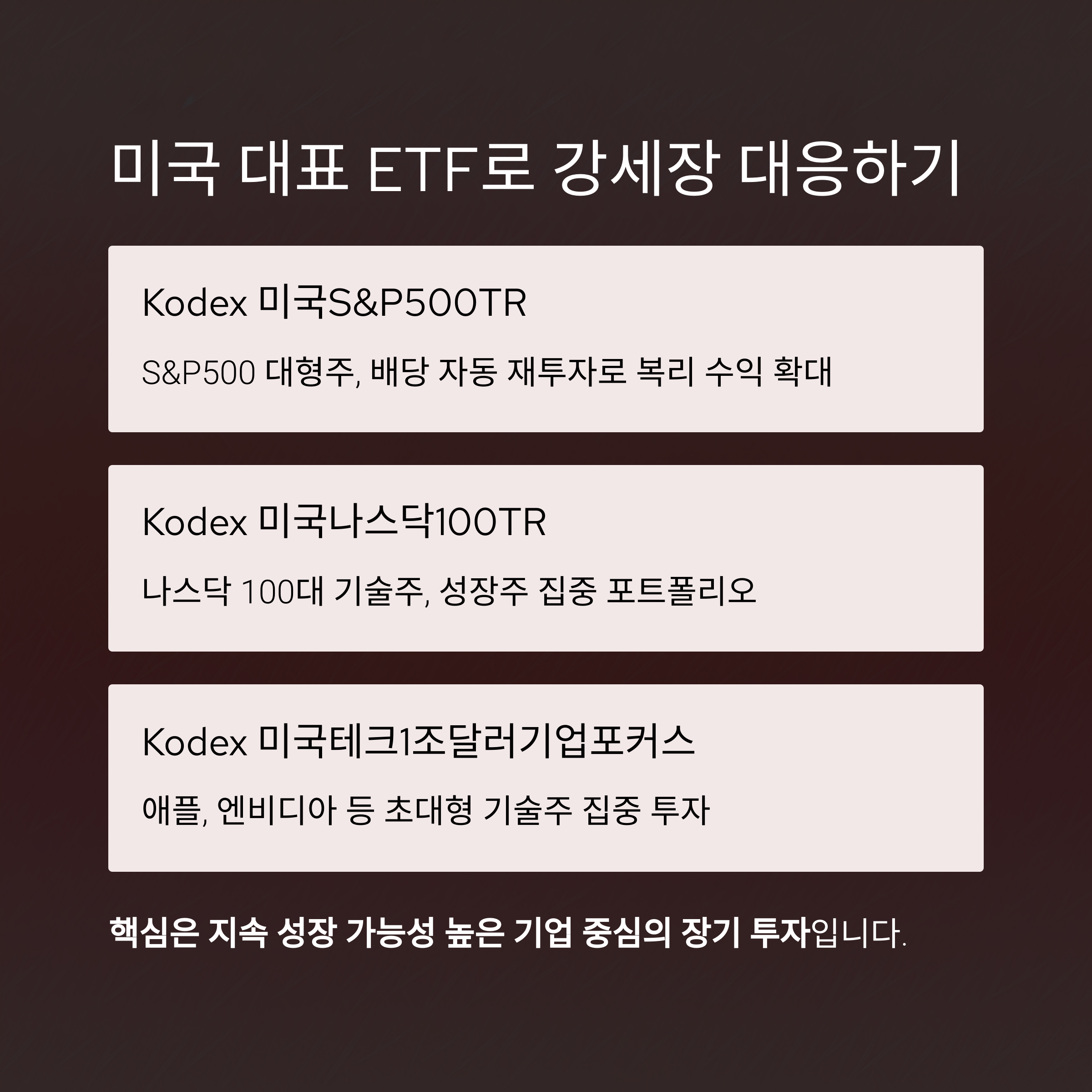 | Kodex 미국S&P500TR | S&P500 대형주 | 배당 자동 재투자로 복리 수익 확대 |