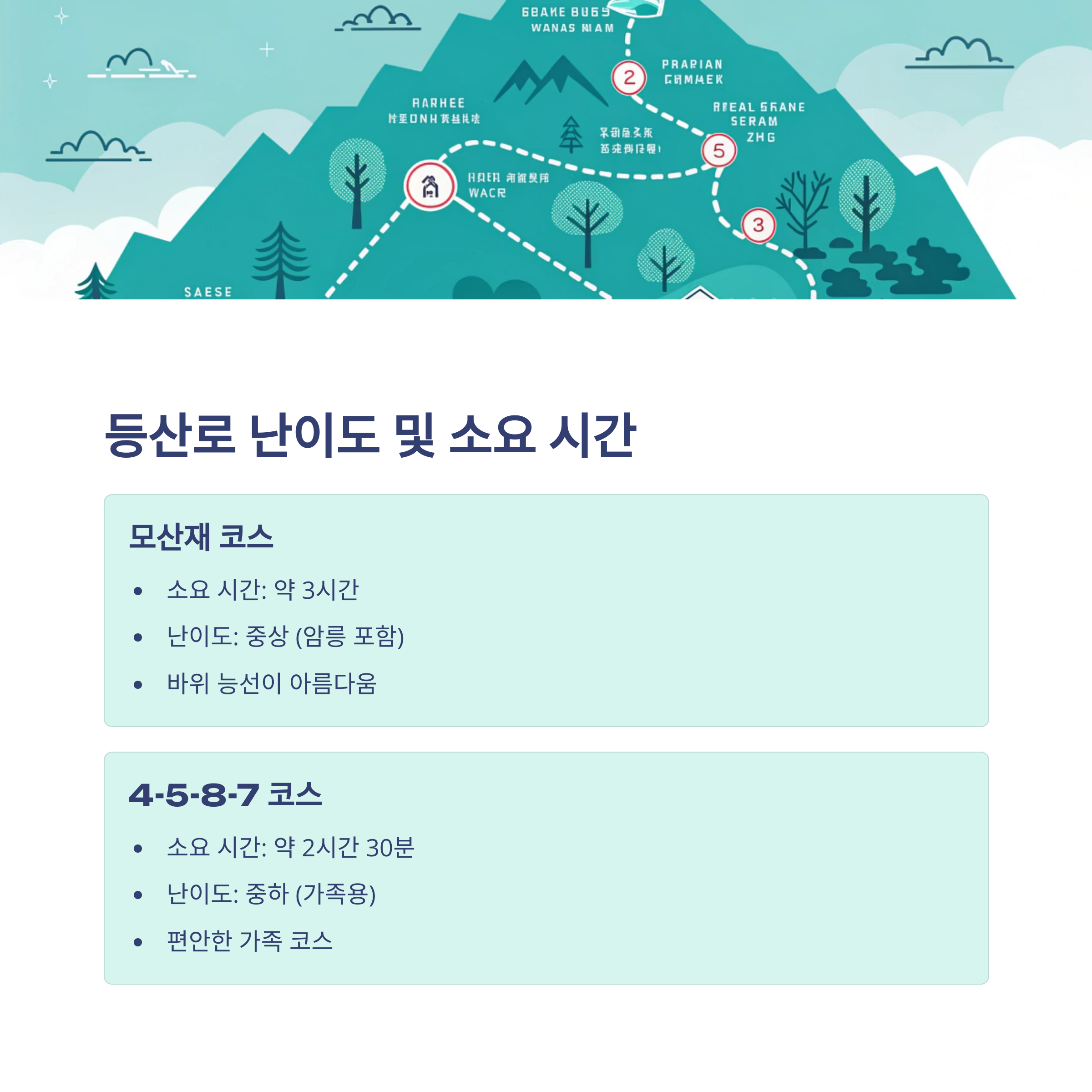 | 모산재 코스 | 약 3시간 | 중상 (암릉 포함) |