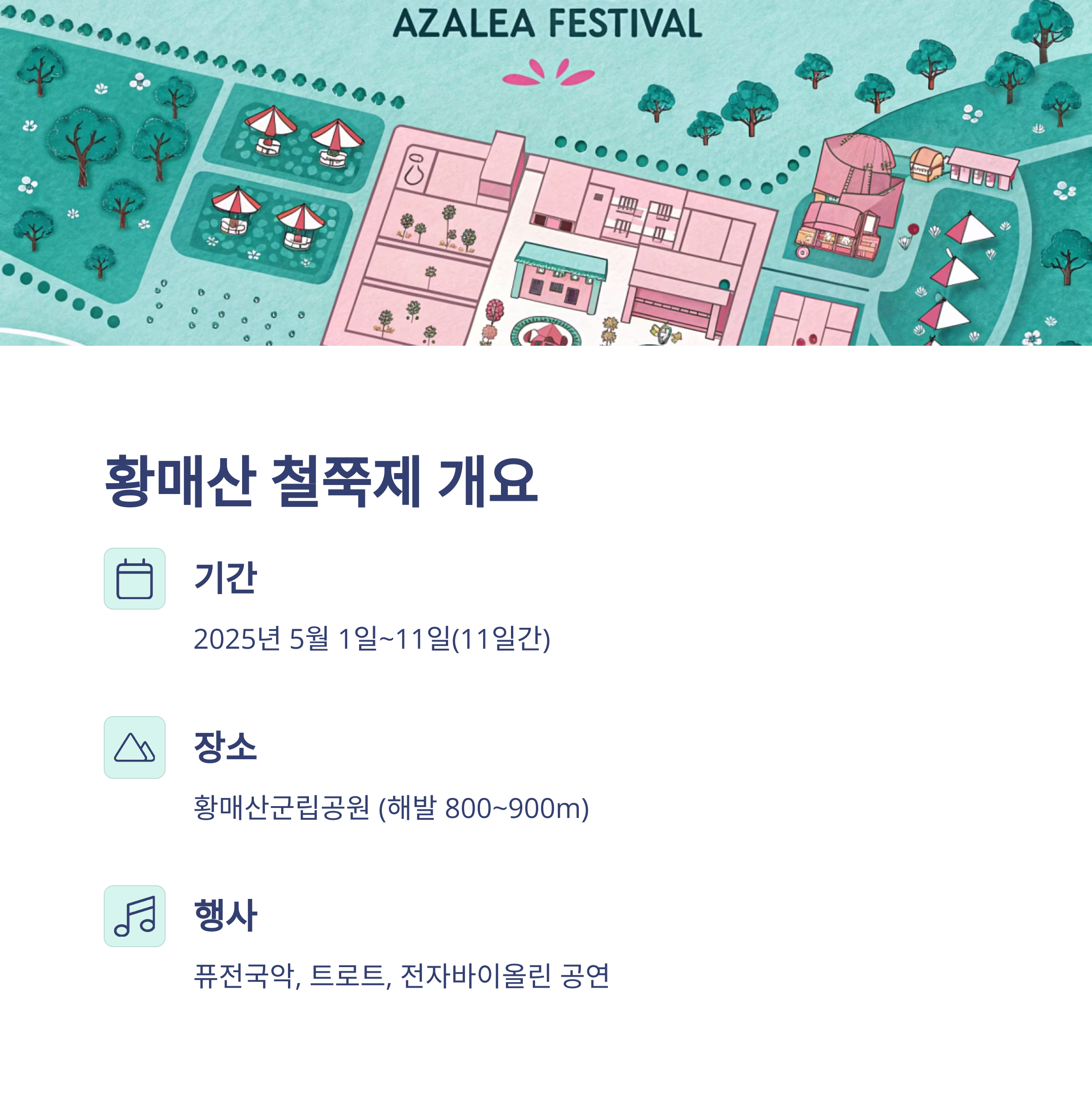 2025년 황매산 철쭉제는 5월 1일부터 11일까지 진행되며, 이 시기 하루 코스로도 충분히 절경을 만끽할 수 있습니다.