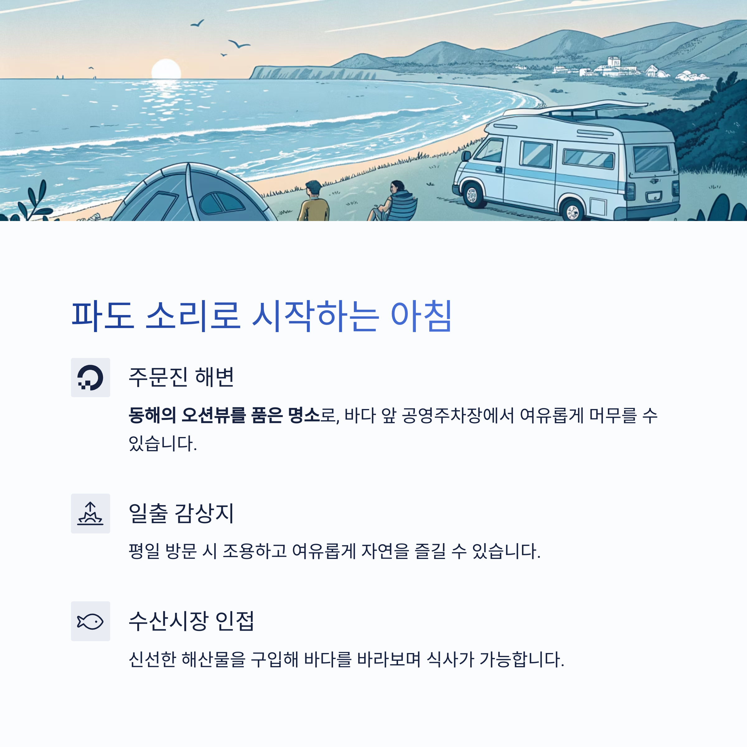 바다 앞 공영주차장에서 여유롭게 머무를 수 있으며, 특히 일출 감상지로 인기가 높습니다.