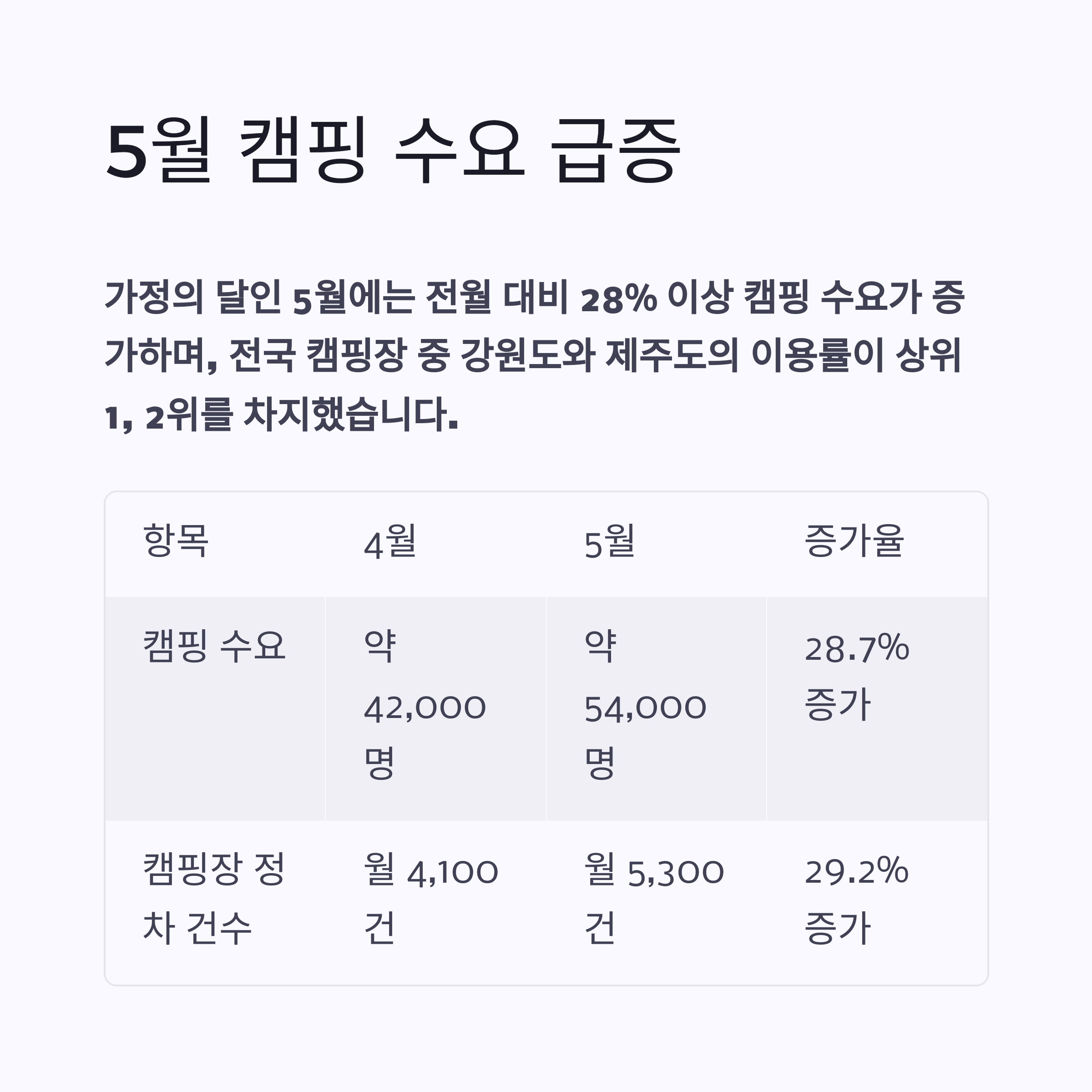 | 캠핑 수요 | 약 42,000명 | 약 54,000명 | 28.7% 증가 |