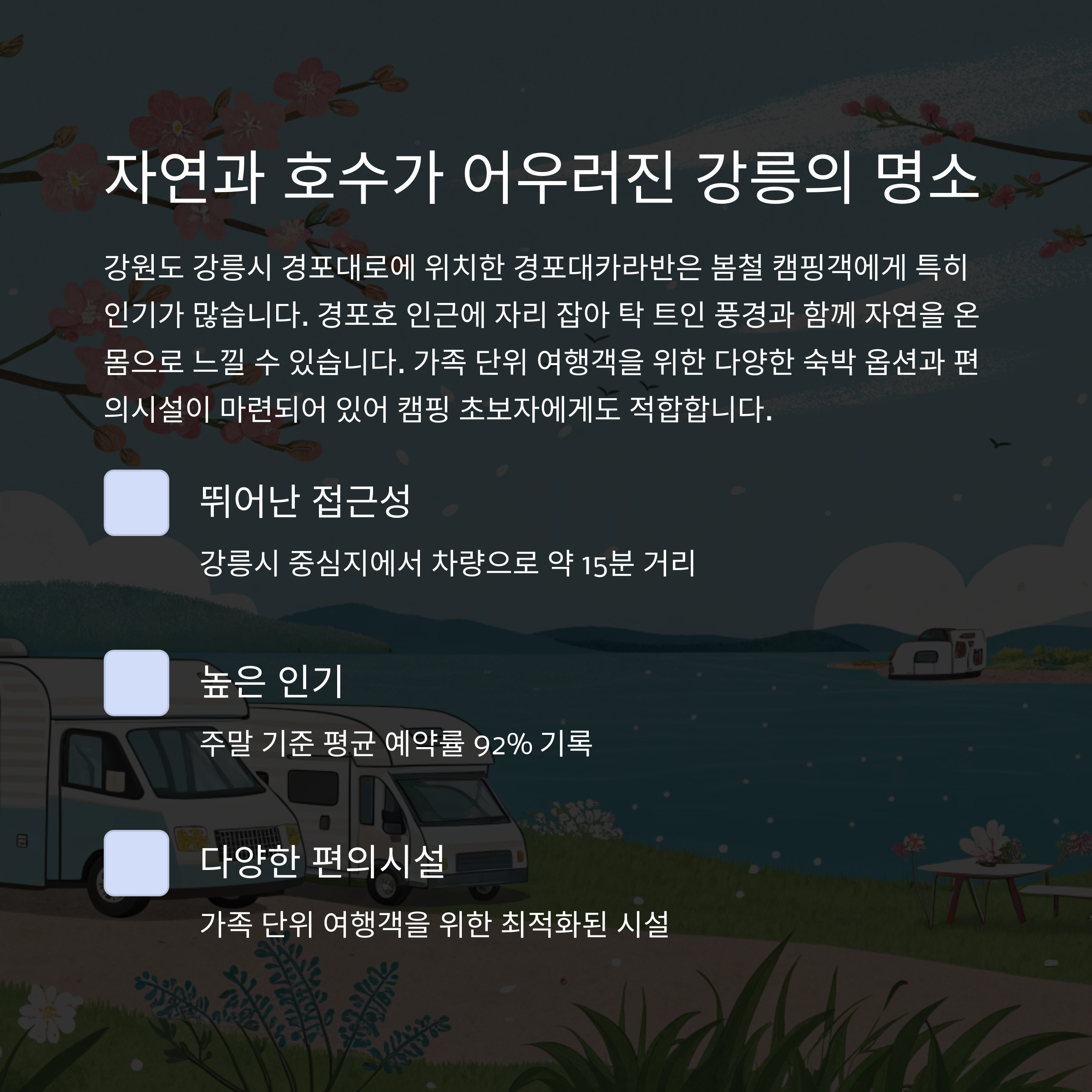 강원도 강릉시 경포대로에 위치한 이 캠핑장은 봄철 캠핑객에게 특히 인기가 많습니다.