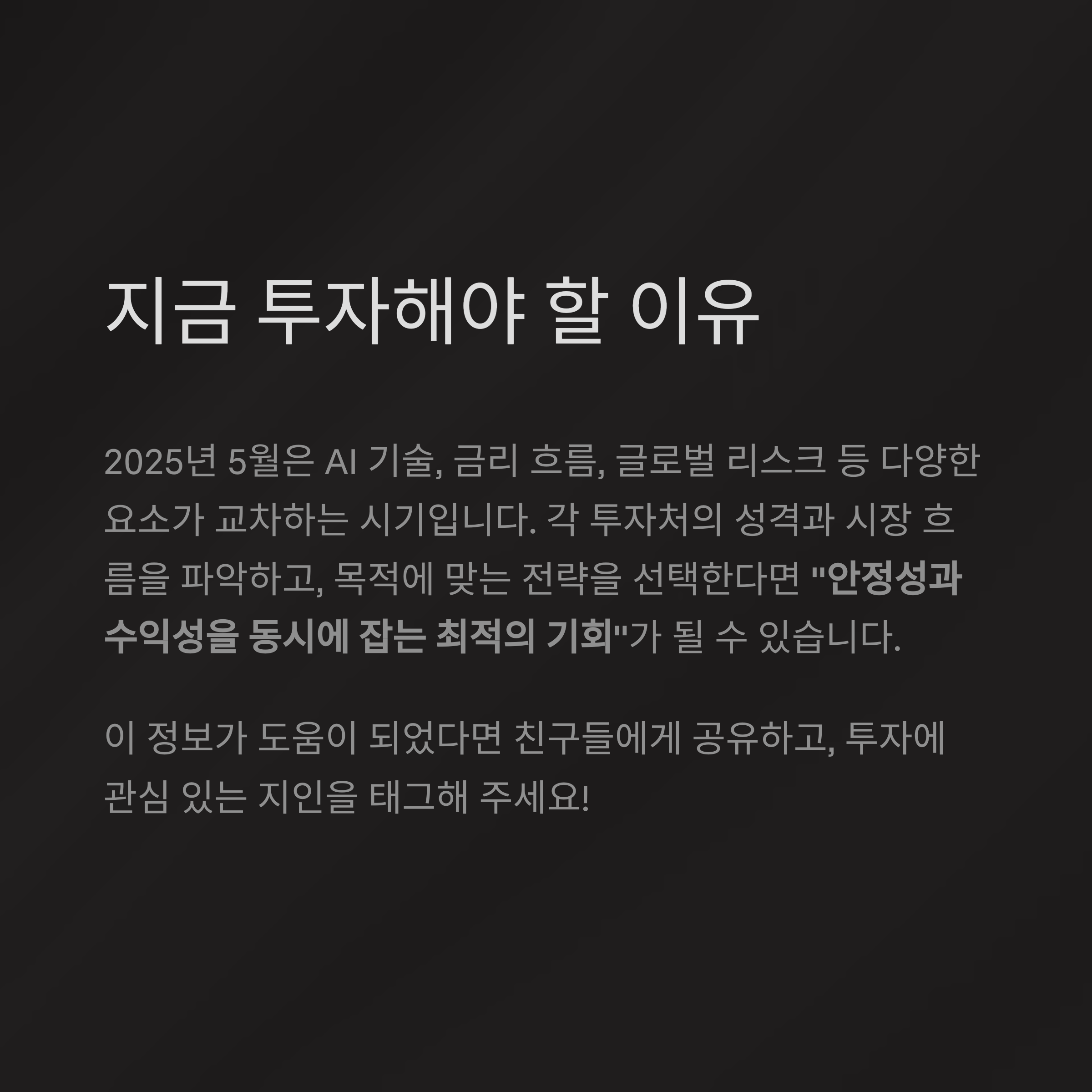 각 투자처의 성격과 시장 흐름을 파악하고, 목적에 맞는 전략을 선택한다면 **"안정성과 수익성을 동시에 잡는 최적의 기회"**가 될 수 있습니다.