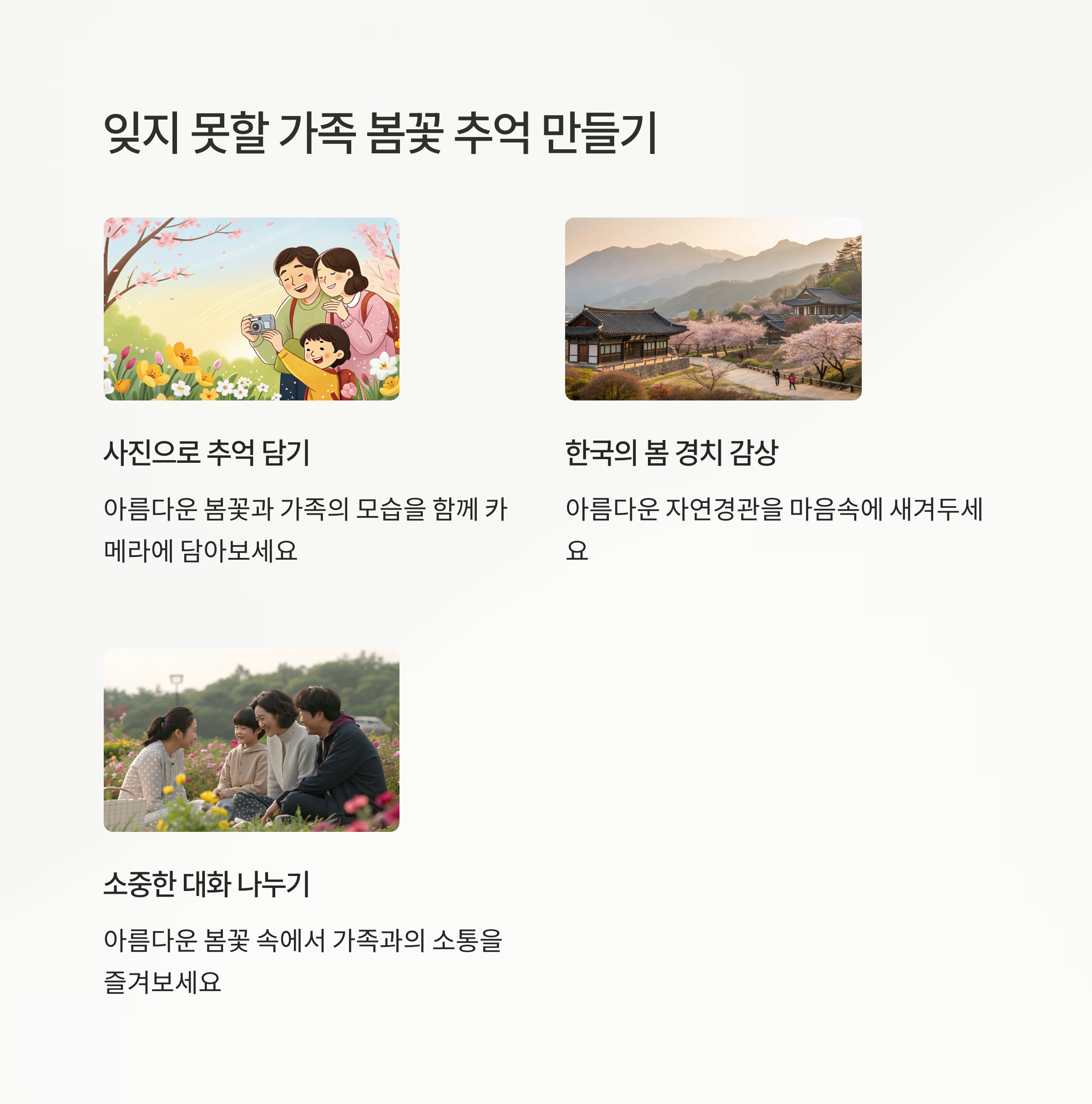 봄꽃 여행지를 선택할 때는 단순히 인기 있는 곳보다는 가족 구성원 모두가 즐길 수 있는 곳을 선택하는 것이 중요합니다. 특히 40대 이상이라면 부모님과 함께 가거나, 자녀와 함께 가는 경우가 많으실 텐데요, 세대별로 선호하는 여행 스타일이 다르다는 점을 고려해야 합니다.