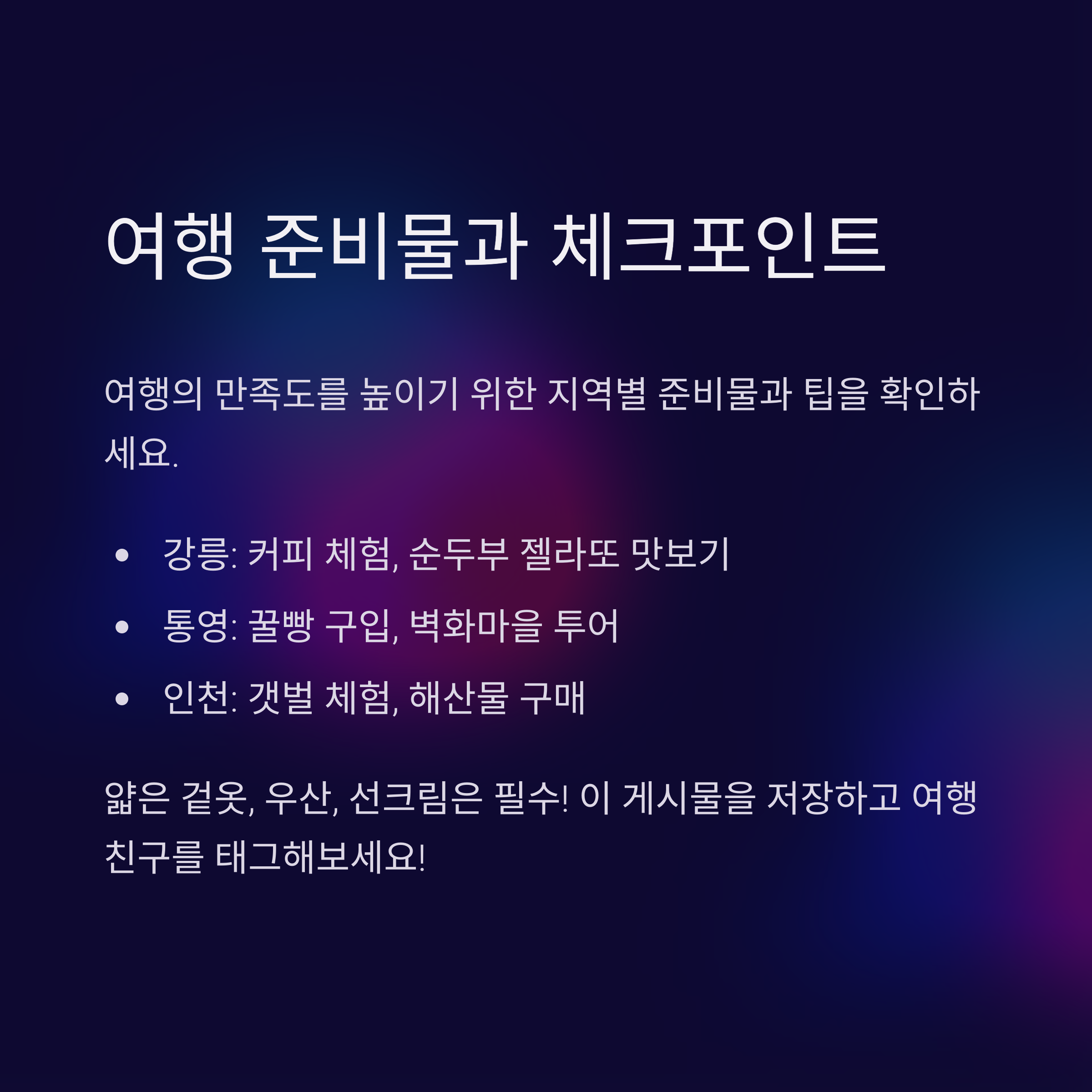 지역별 준비물과 팁을 마지막으로 정리합니다.