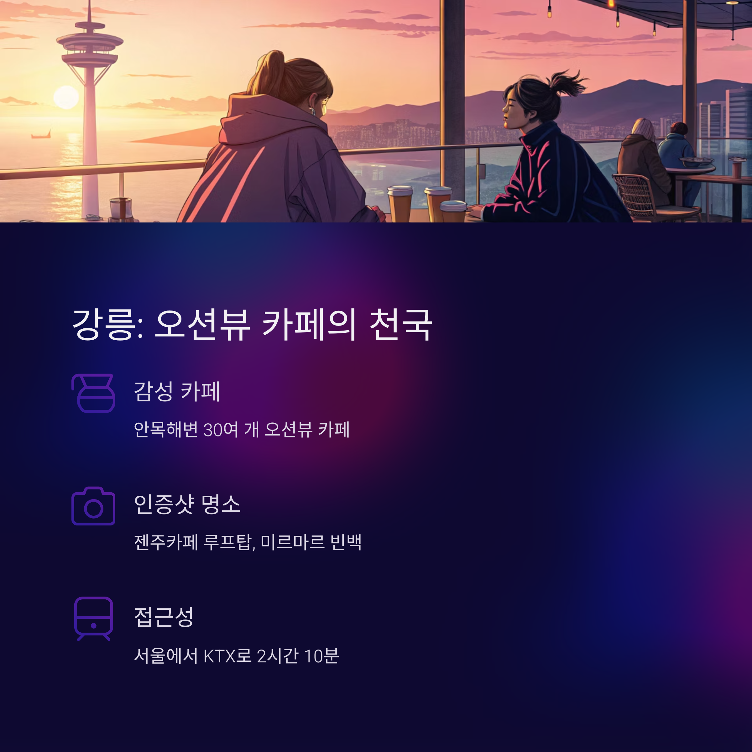 강릉은 푸른 바다와 감성 넘치는 카페가 공존하는 대표 여행지입니다.
