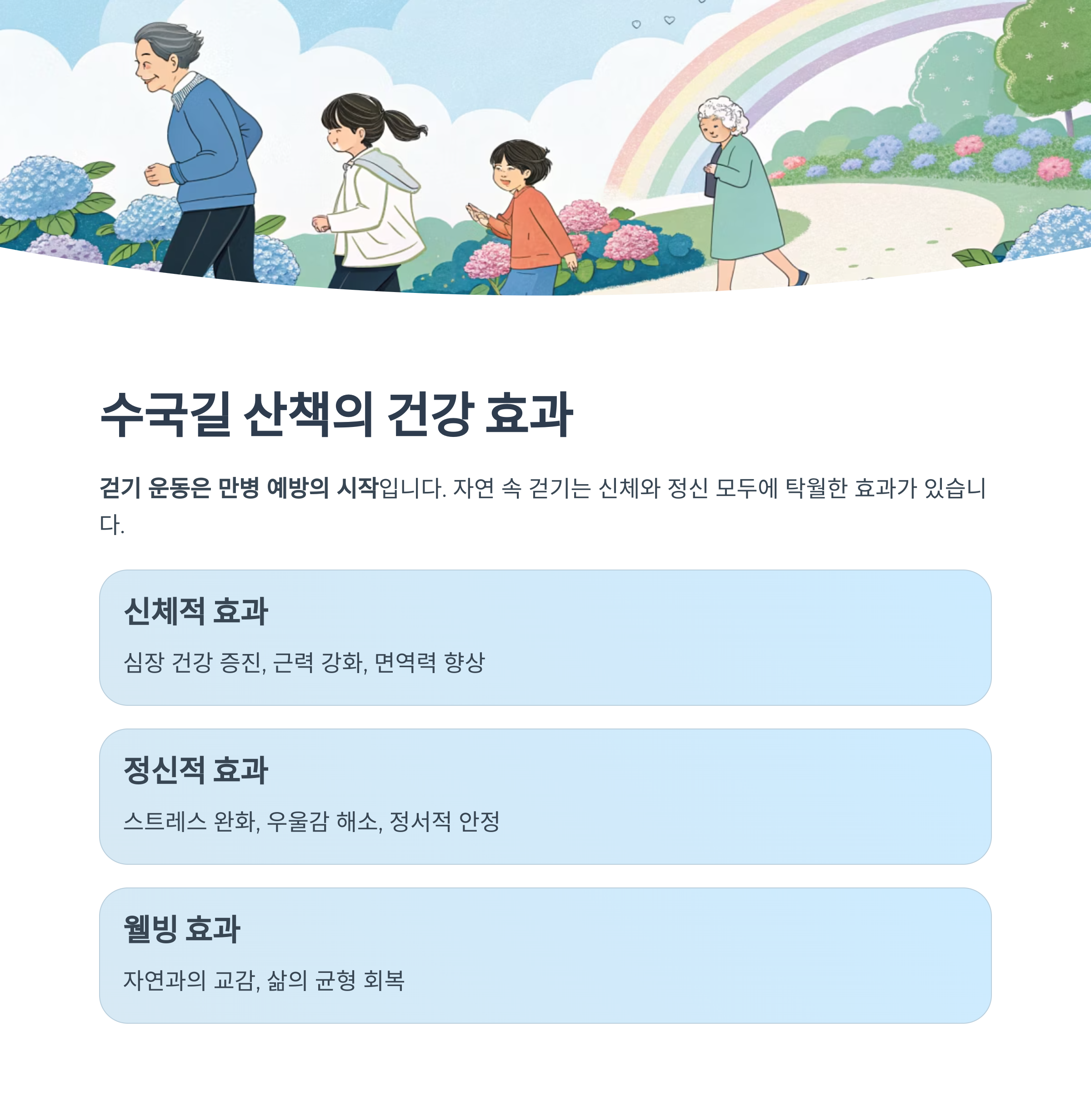 숲속 산책로를 따라 펼쳐진 수국길은 산림욕과 걷기 운동을 함께 제공합니다