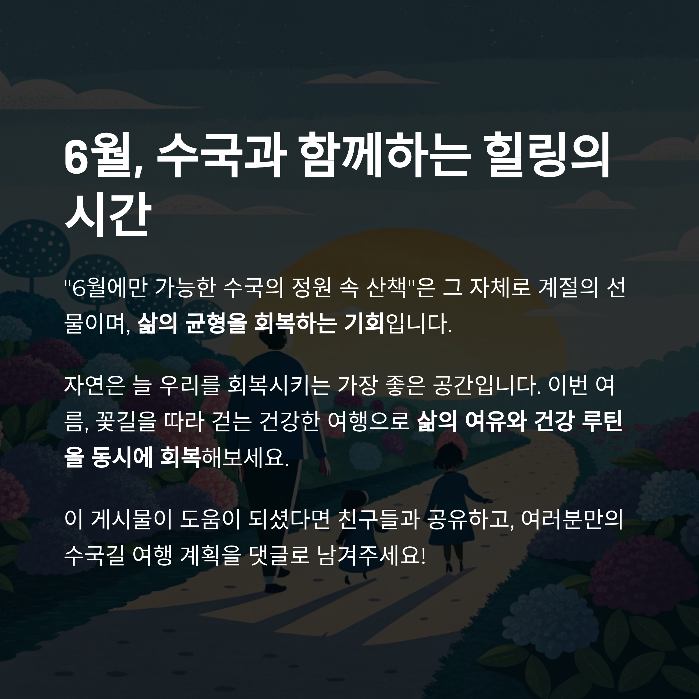 6월은 수국이 만개하는 계절로, 걷기 좋은 축제와 웰빙 여행의 최적기입니다