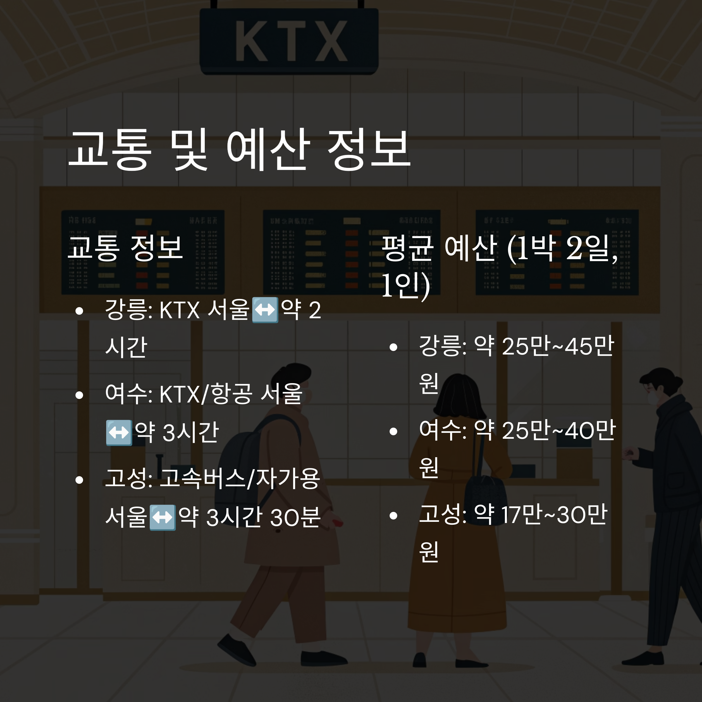 | 교통 | 약 10만 원(KTX 왕복) | 약 10만 원 | 약 6만 원(고속버스 왕복) |