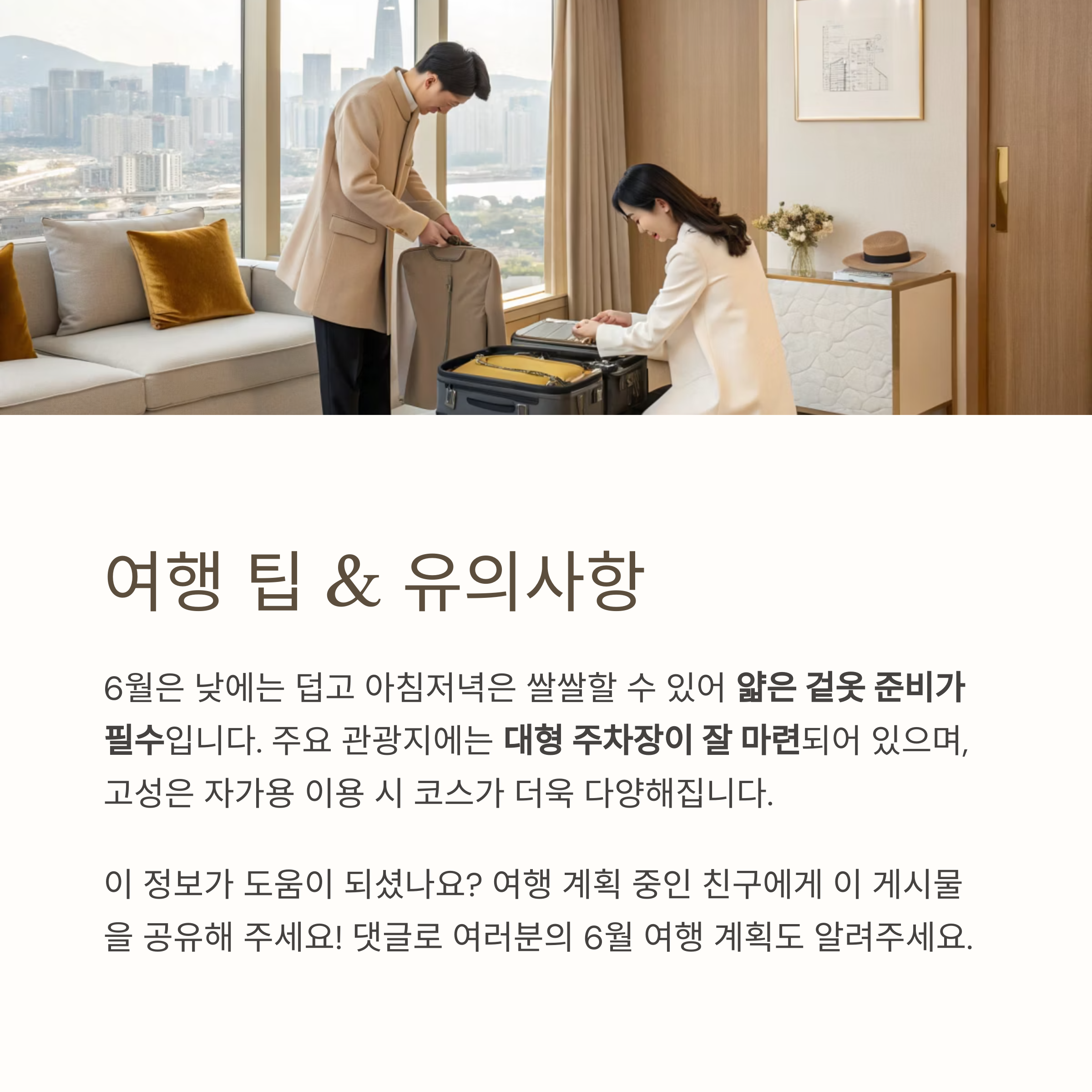 6월은 낮에는 덥고 아침저녁은 쌀쌀할 수 있어 얇은 겉옷 준비가 필수입니다.