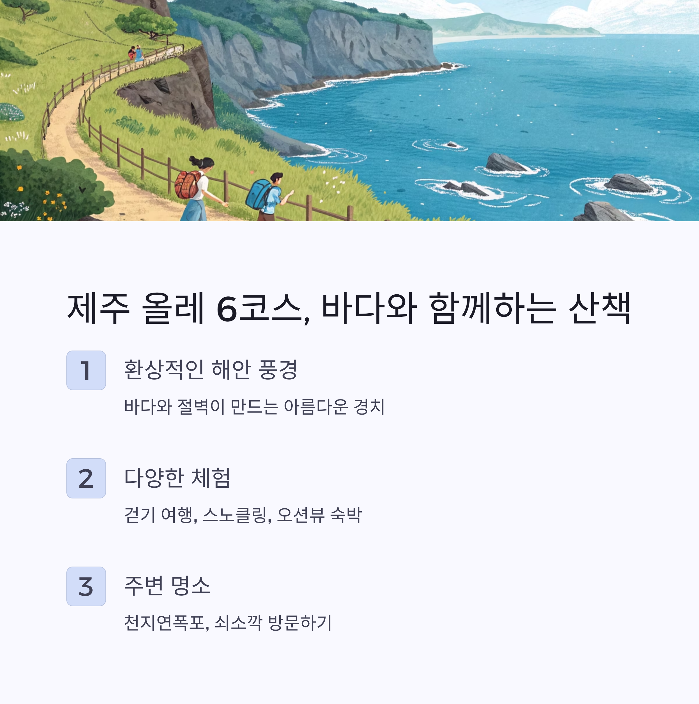 | 제주 올레길 | 바다풍광, 트레킹 | 걷기여행, 스노클링 |