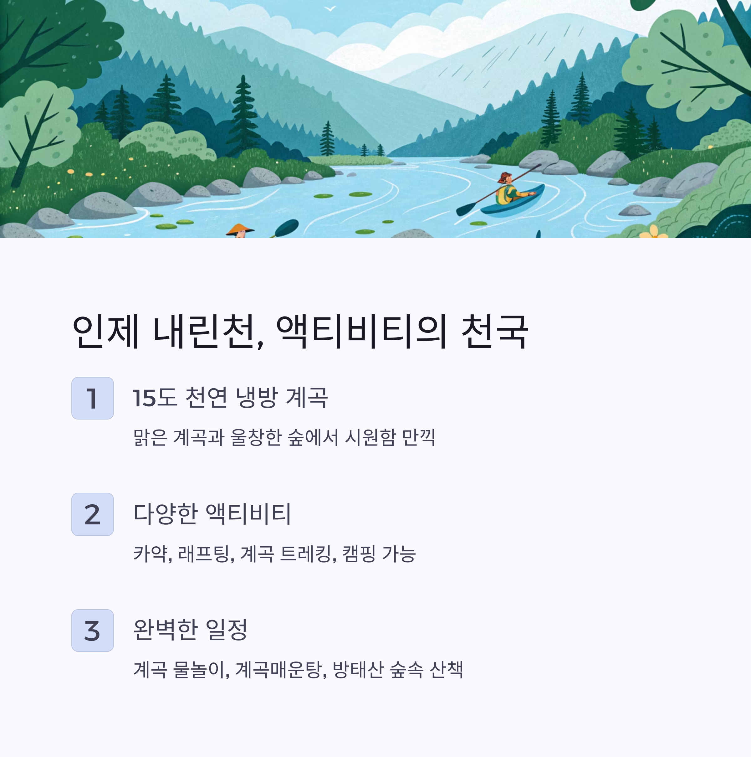 | 인제 내린천 | 냉천욕, 액티비티 | 래프팅, 계곡 트레킹 |