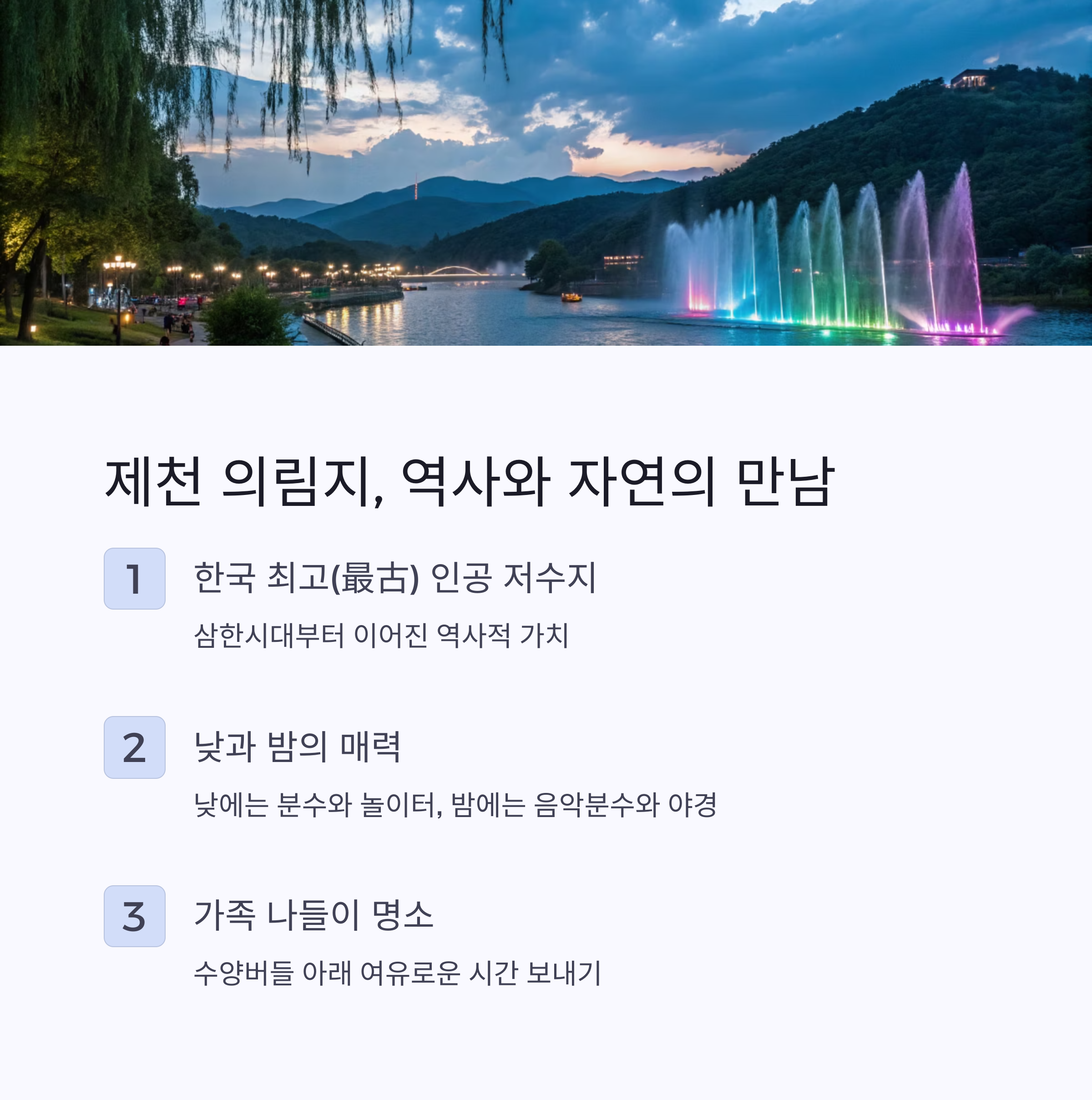 | 제천 의림지 | 역사공원, 음악분수 | 야경 산책, 지역 먹거리 |
