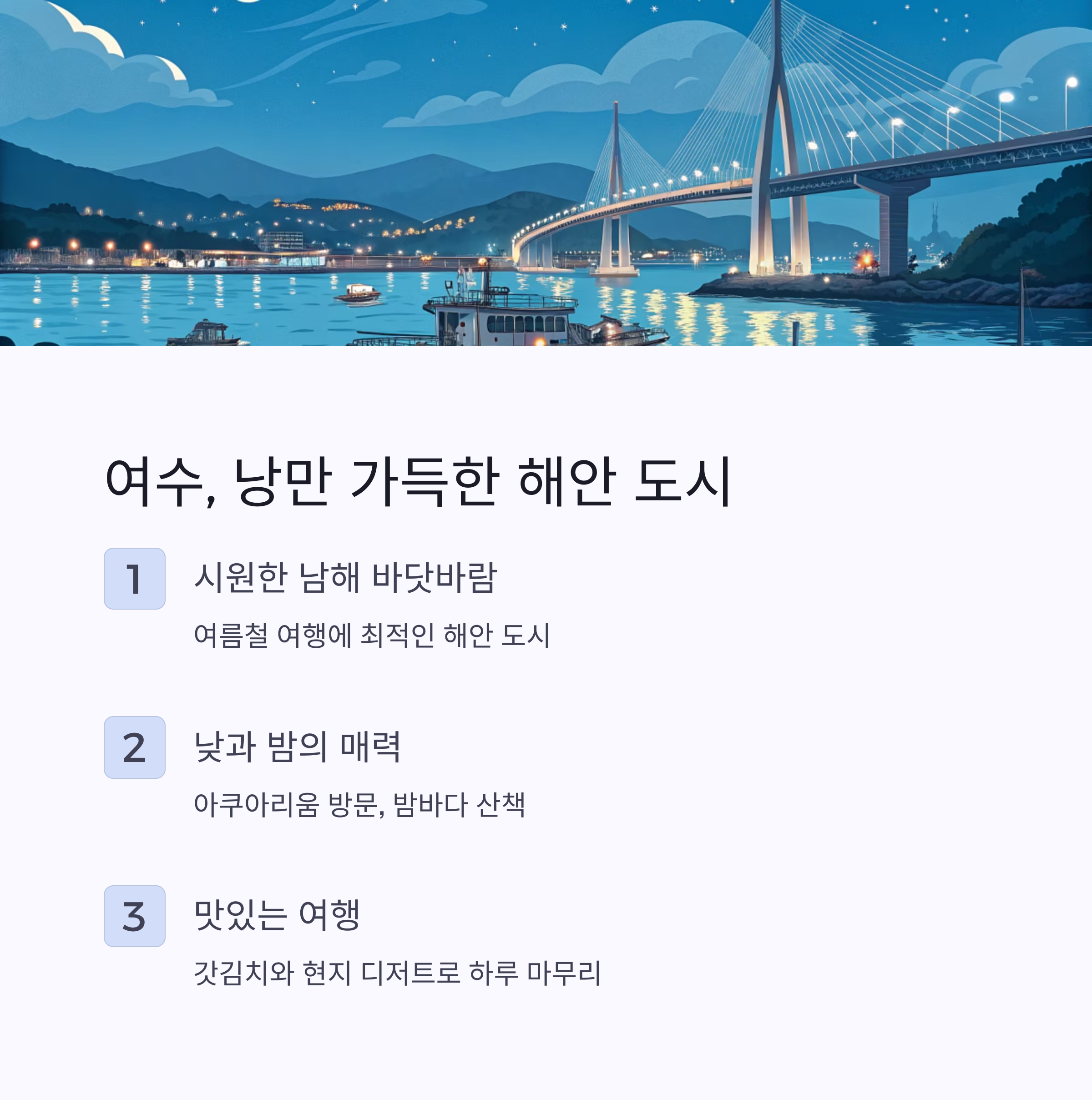 여수는 남해 바닷바람으로 여름철 여행에 최적인 도시입니다. 아쿠아리움 방문과 낮 동안의 관광지를 둘러본 후 밤이 되면 바닷가 산책을 즐기고, 갓김치와 다양한 현지 디저트로 하루를 마무리할 수 있는 1박 2일 여행지로 사랑받고 있습니다.