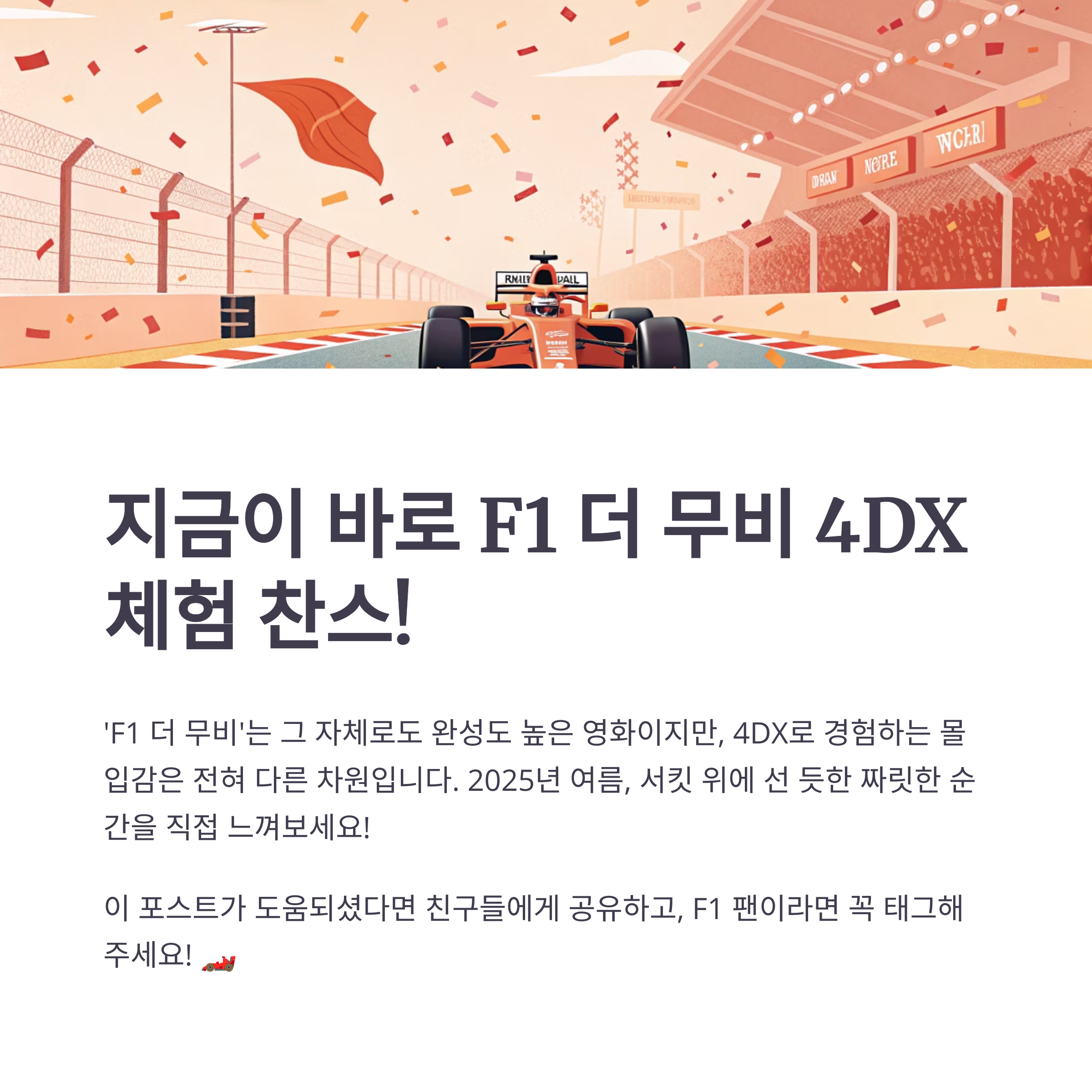 2025년 여름, 브래드 피트 주연의 'F1 더 무비'가 4DX 포맷으로 국내 상영되며 관객들에게 뜨거운 반응을 얻고 있습니다. 실제 F1 서킷에 들어간 듯한 리얼한 현장감과 체험형 효과 덕분에 영화의 몰입도는 물론, 관람 만족도까지 수직 상승 중인데요. 이번 글에서는 4DX 상영의 기간, 위치, 특전, 예매 팁 등 모든 정보를 정리해드립니다.